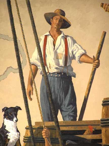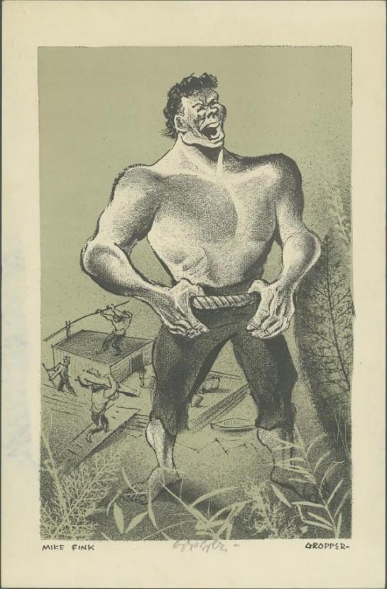For those that do not know him: Mike Fink was a Keelboat man. Way back when American wild was still being conquered keelboats become the chief vessels of commerce on the Ohio and Mississippi rivers. The men who worked the keelboats were stereotypically strong because they had to push the boats against the current.