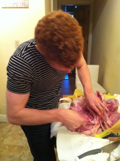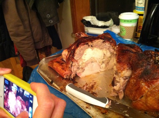 As it was cooking Alex explained to me why the Turducken is great: it’s the duck. Ducks are little fatties- and Turkey and Chicken breast can be dry. When you cook a turducken the duck meat is pressed between the turkey breast and the chicken breast. As the three birds cook the duck fat keeps everybody moist, so all the white meat on the turkey and chicken comes out succulent and moist (basically it makes it more like dark meat, which is generally more awesome).